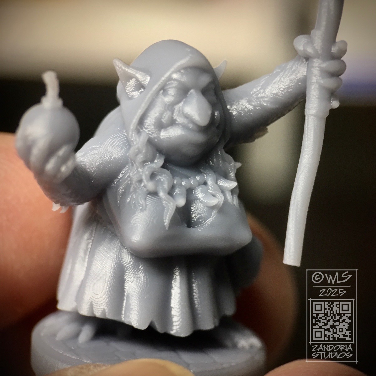 Goblins combined foul and stinky substances from their caves–batshit, sulpher, ashes–accidentally discovered a crude gunpowder, and invented the goblin bomb! This goblin mother is the leader of her pack. She has a bomb in one claw, and a magic staff topped with a goat skull in the other.